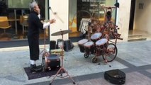 Une sympathique performance avec cet artiste de rue qui est capable de jouer de la batterie tout en jonglant avec les baguettes, en rythme avec une musique diffusée par deux enceintes.