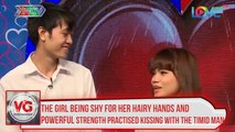 The girl being shy for her hairy hands and powerful strength practised kissing with the timid man