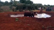 Rescued baby elephant is reunited with mum after getting stuck in water hole