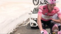 Leader du Tour d'Italie, Steven Kruijswijk nous gratifie d'un superbe soleil en pleine neige. Heureusement sans gravité.