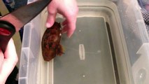 A l'aide d'une paire de ciseaux, un homme ouvre un oeuf de requin-chabot bambou posé dans une bassine d'eau. Une fois ouvert, le bébé requin sort de l'oeuf et nage dans l'eau de la bassine. Le Requin-chabot bambou ( ou Chiloscyllium punctatum) est ovipare et peut mesurer jusqu'à 1 mètre. Il vit dans l'Indo-Pacifique
