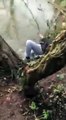 cette femme réussit à traverser un cours d’eau sur un tronc d’arbre, mais une fois sur la terre, elle a glissé et tombe finalement dans l’eau
