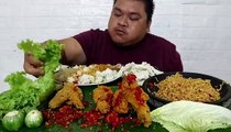 Mukbang Fried Chicken with Spicy Sauce, Fried Noodles, Rice, Raw Vegetables, Crackers, Lettuce and Eggplant