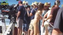 Kate Walsh running on the beach wearing a skin color bikini swimsuit while filming tv show Bad Judge. Check it out
