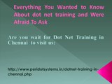 We are offered Dot Net training in Chennai one of the most powerful institution surrounded areas. Asp.net essential training was developed by microsoft. Our institute provided by in today's new technological world there is a lot of more scope of Asp.net training in Chennai.Dot net training in Chennai is a more efficient language which uses tool to developed a properly and perfect usage application. Dot net course in chennai provided programming language is in very highly demand in the current IT industry. <br /> <br /> After complete the dot net training course content we are provided live projects,live demo and real time projects our company certification. We understand of the Dot net training in chennai hence provided proper career guidance to all the training students have complete there Asp.net training in Chennai. <br /> <br />Dot Net course in chennai http://www.peridotsystems.in/dotnet-training-in-chennai.php