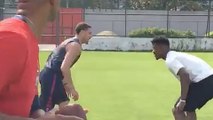 Entre deux rencontres, Jimmy Butler et Klay Thompson ont troqué leur balle orange pour un ballon de football américain le temps d'un entraînement. Ici, les deux hommes jouent tour à tour receveur et défenseur, avec l'entraîneur assistant de Team USA Monty Williams à la passe.