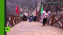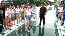 En Chine, pour tester leur nouveau pont tout fait de verre, les responsables demandent à leurs employés de donner de grands coups de masse sur les vitres.
