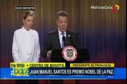 Bogotá, 7 oct (EFE).- El presidente de Colombia, Juan Manuel Santos, dijo que el Premio Nobel de la Paz con el que fue galardonado hoy constituye "un mandato" para sacar adelante el acuerdo con las FARC rechazado en el plebiscito del pasado domingo.<br /><br />"Este Premio Nobel de la Paz llega en un momento muy oportuno porque lo considero un mandato para encontrar una solución rápida a este problema, esta situación que se generó con el plebiscito", manifestó el jefe de Estado en un acto con promotores del "sí" en la consulta popular.<br /><br />IMÁGENES PRESIDENCIA Y EFE.<br />Palabras clave: efe,premio,nobel,paz,juan manuel santos,nomonetizar.