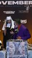 Oscar de la Hoya brings her girlfriend dressed like a nun for Halloween to a press conference of Floyd Schofield vs Rene Telles fight