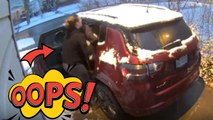 Woman falls on black ice with baby but bounces back on her feet