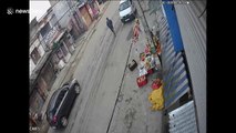 Dramatic footage, from China, of an out-of-control car flipping over into a flowerbed narrowly missing a pedestrian.<br /><br />The CCTV video, filmed in Suzhou, Jiangsu Province last month, shows an out-of-control SUV narrowly avoiding a pedestrian before it flips over into a flowerbed.<br /><br />The road was reportedly slippery after it rained and the driver took a turn at high speed, making him lose control over his vehicle. <br /><br />Fortunately, people in car only suffered minor injuries.