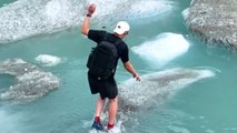 Boy jumps over ice flakes on a glacier with ease and fun