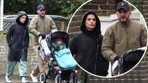 Tom Hardy braves the wet weather in padded bomber jacket as he enjoys a family stroll with wife Charlotte Riley and their first child.