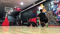 Basketbalspeler slaat bal in de basket met slingshot