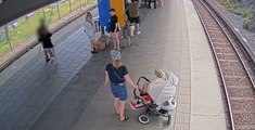 Une femme pousse un homme en béquille sur les rails du train dans une gare (Stockholm)