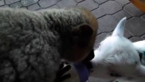Baby goat VS baby Lemur... So cute... Fight for the milk bottle.