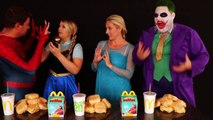 Frozen Elsa & Spiderman McDONALD'S CHALLENGE! w_ Joker Maleficent Princess Anna Toys! Superhero Fun-1lbP