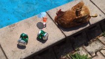 Un groupe de poules volantes se précipitent sur un homme sur un chemin de campagne. C'est impressionnant !
