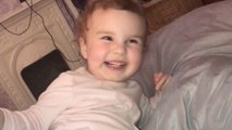 Little girl plays on bed and laughs while trumping on demand