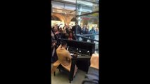 Footage has emerged of singer John Legend performing at London St Pancras station, UK.<br /><br />The video, captured on Wednesday, shows the musician singing and playing his song 'Sure' on the piano, surrounded by a huge crowd.
