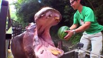 It puts a whole watermelon in the hippo's mouth. The animal's reaction is amazing!