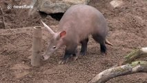 Cute two-week old aardvark has fun at zoo