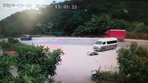 Chinese motorcyclist lands on his feet after collision with minibus and runs away