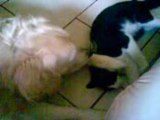 Deux fun félin drôle de chat lèche un énorme chien! Regardez!