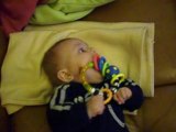 Camille faisait soit diant la sieste chez mamie, mais en fait, ce petit coquin jouait avec son lion ! C'est d'ailleurs les premiers jours où il commençait d'attraper des choses...