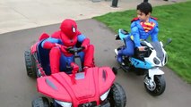 SUPERMAN vs SPIDERMAN POWER WHEELS RACE GIANT SURPRISE TOYS KIDS opening PLAYTIME AT THE P