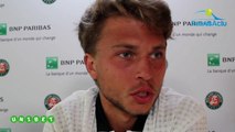 Malgré un match courageux, Alexandre Muller s'est incliné ce mardi au premier tour de Roland-Garros face au Brésilien Thiago Monteiro (22 ans, 95e) après un combat de cinq manches (7-6 (4), 2-6, 4-6, 7-6 (3), 6-0) et presque quatre heures de jeu. Le Français de 20 ans, 330e mondial et qui a bénéficié d'une wild-card pour intégrer directement le tableau principal, était forcément déçu d'avoir perdu mais arborait tout de même un large sourire au moment de s'exprimer devant la caméra de Tennis Actu. Supporter de l'Olympique de Marseille, Alexandre Muller s'est présenté au grand public, et a également évoqué les jeunes Français qui ont fait polémique ce mardi. En l'occurence : Maxime Hamou, envoyant balader les médias après ses qualifications victorieuses, mangeant des chips en conférence de presse ou voulant embrasser de force une journaliste d'Eurosport... et Laurent Lokoli, refusant de serrer la main de son adversaire, avec un geste "limite", après sa défaite contre Martin Klizan. Retrouvez sa conférence de presse en vidéo ci-dessuus.