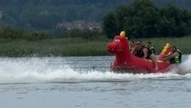 Grown-ups embrace childlike fun while riding inflatable dragon tube on the water