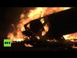A dramatic clip has emerged from China of a brave driver risking his life to move a burning lorry away from buildings.<br /><br />In the security camera video, which was filmed in Suzhou, Jiangsu Province on August 2, the lorry carrying foam suddenly burst into flame and quickly becomes an enormous blaze.<br /><br />Amazingly, the driver then gets into the cab of the burning vehicle and drives it away from the surrounding warehouses to prevent the fire from spreading.<br /><br />The fire was put out by locals working alongside the police, according to reports.<br /><br />There were no injuries, according to local media.