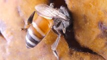 Des abeilles nettoient une abeille recouverte de miel