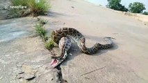 The 17ft long python was found hiding under the sink at a home in Pathum Thani, Thailand, and forced to regurgitate the family's pet cat. *** For full story and to licence this clip in a commercial player contact video@viralpress.uk***