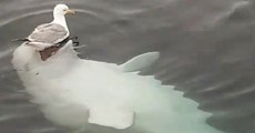 Belooga whale is playing with sea bird