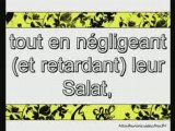 1. Vois-tu celui qui traite de mensonge la Rétribution ?<br />2. C'est bien lui qui repousse l'orphelin,<br />3. et qui n'encourage point à nourrir le pauvre.<br />4. Malheur donc, à ceux qui prient<br />5. tout en négligeant (et retardant) leur Salat,<br />6. qui sont pleins d'ostentation,<br />7. et refusent l'ustensile (à celui qui en a besoin).
