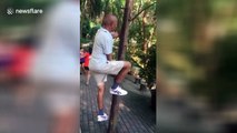 Chinese elderly man hangs on tree and cycles in air
