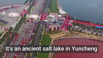 An ancient salt lake in China has turned pink and green