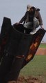 Syrian villagers climb unexploded Iranian missile that landed in sheep meadow