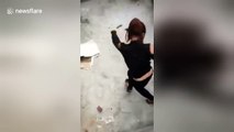 This was the hilarious moment a woman was sweeping the floor and an angry RAT started chasing her round in circles in Hai Phong, Vietnam.