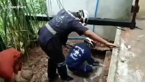 This is the touching moment two puppies were rescued from under a flooded building as their desperate mother looks on.<br /><br />Pricha Khomarum, 32, heard the dogs and their mum crying after four days of heavy rain in Pattaya, Thailand, on October 4.<br /><br />The construction worker dug his way through the wet mud then reached inside to free the mother and grab the two trembling puppies as the older dog paced around nervously outside.<br /><br />Pricha emerged with the two young puppies which had been living under the building with their mother where had made a den. They had been in the soaking puddle for several days.<br /><br />Three other puppies which Pricha could not find are believed to have drowned in the flood water. <br /><br />Pricha, who has now adopted the two youngsters, said: ‘’The mother dog had dug down under the office building to give birth to her babies. <br /><br />‘’There had been four days of rain, very heavy, strong rain. I went to work in the morning and saw the flood. I could just hear the mother’s voice so I pulled her out first.<br /><br />‘’She was staying with her puppies trying to save them, even though it was wet and flooded. <br /><br />‘’I pulled her out first then dug the ground to break away the edges of the hole and let some of the water out.<br /><br />‘’I found two survivors inside but none of the others. I’m looking after them so that if ever there is a flood, they’ll be inside where it is safe and dry.’'