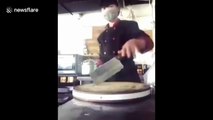 Chinese chef shows off meat cleaver spinning skills