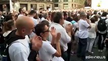E’ stato accolto da applausi Mariano Rajoy al suo arrivo a Barcellona, in vista dell’apertura ufficiale della campagna elettorale, per il voto del 21 dicembre in Catalogna. Il Primo Ministro spagnolo, nemico numero 1 degli indipendentisti e alla prima visita nella regione dopo il commissariamento e la destituzione del Govern, si trova nel capoluogo per lanciare il capolista del suo partito – il PP – Xavier Albiol.<br /><br />Directo https://t.co/58pTT4gbwM Rajoy: "Queremos vivir juntos" pic.twitter.com/46cWpYCB9D— EL PAÍS (@el_pais) 12 novembre 2017<br /><br />Questo, l’indomani della manifestazione degli indipedentisti. 750.000 persone sono scese in piazza a Barcellona, per chiedere la scarcerazione dei prigionieri politici catalani detenuti a Madrid. Il Presidente della Generalitat destituito Carles Puigdemont è apparso sui maxischermi in un video registrato in Belgio, dove si trova da due settimane, nel quale ha chiesto ai suoi sostenitori di mantenersi molto attivi’‘. <br /><br />11/11/2017 gran manifestaciò cìvica a #Barcelona #Llibertatpresospolitics pic.twitter.com/PvPAEARSt9— sisóvidalestrany (@narcisvidal7) 11 novembre 2017<br />