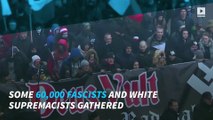 Tens of thousands of people joined nationalist marchers waving flags and burning flares in Warsaw on Saturday during protests held on Poland's independence day. Protesters carried banners that read "White Europe,"Europe must be white," and "Pray for an Islamic Holocaust." Some wore masks and waved red and white Polish flags, chanting "Death to enemies of the homeland," and "Catholic Poland, not secular." While the vast majority were Poles from all over the country, other protesters came from all over Europe. <br />