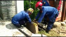 This is the heart-warming moment when seven men prized a concrete sewer to rescue two stranded kittens. <br /><br />Passers-by heard faint meows coming from under the ground in Saraburi, Thailand, on November 10 at 11.30am. <br /><br />They used a power-drill, three metal poles and a pickaxe to open the heavy lid covering the filthy water - before reaching inside to get the moggies.<br /><br />One frail feline covered in filth was freed and went scampering along the ground after his first feeling of freedom. Moments later another kitten was hauled to safety.<br /><br />Onlooker Pra Khemphong said: ''Even street cats love their lives and fear to die. They have the same feelings that we have as humans."<br /><br />"I would like to thanks, everyone who helped to rescue the cats. The people who helped to rescue the kittens should be very proud. That is their good deed of the day. Every life matters no matter how small."<br /><br />It is not known how the kittens came to be stuck in the sewer but they may have been born in there. There was no sign of the mother.<br /><br />Pra Khemphong added: "The local charity will look after the two kittens and give them to good homes."