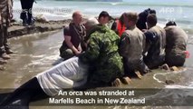 The New Zealand army and volunteers help refloat a stranded orca on Marfells Beach near Blenheim.<br />