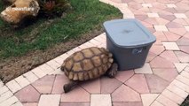 "Out of my way, box!" Tortoise rams plastic container