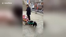 Father uses dog to pull baby in homemade two-wheeler