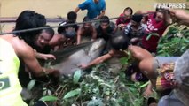This is the incredible moment dozens of villagers team up to rescue a 200kg stranded swamp fish. <br /><br />The enormous Mekong giant catfish, a critically endangered species, had lived in marshes in coastal province Phatthalung, southern Thailand, since 1991, becoming a local legend.<br /><br />But heavy rains at the end of last month caused flooding in the region - washing the massive beast from its home into a tiny pond. <br /><br />The waters subsided and on Monday (11/12) morning and residents spotted the creature - nicknamed the ’swamp king’ by locals - frantically thrashing around in the shallow water. <br /><br />They banded together and used a giant net to haul the wild fish out of the water and onto a motorbike trailer before racing over two miles to return it to its original home. <br /><br />Footage captured the entire rescue - which took more than six hours - as they released the Pangasianodon species of catfish back into its original stretch of water during sunset. <br /><br />Resident Khun Sooktong, from the Phatthalung district, said: ‘’This is a natural fish that was left in the marshes of the village in 1991. We call it the swamp king. It’s like a monster. <br /><br />''At the end of November, continuing to the beginning of December this year, rain made the swamps overflow. There was more rain this year than ever before.<br /><br />‘’It’s expected that the fish escaped from one swamp and went into another, about three km from the village. <br /><br />''I found it on December 12 but at the time was not able to handle it. So on Monday a lot of people came to help and it took sixes hours to release the fish to its original home.’'